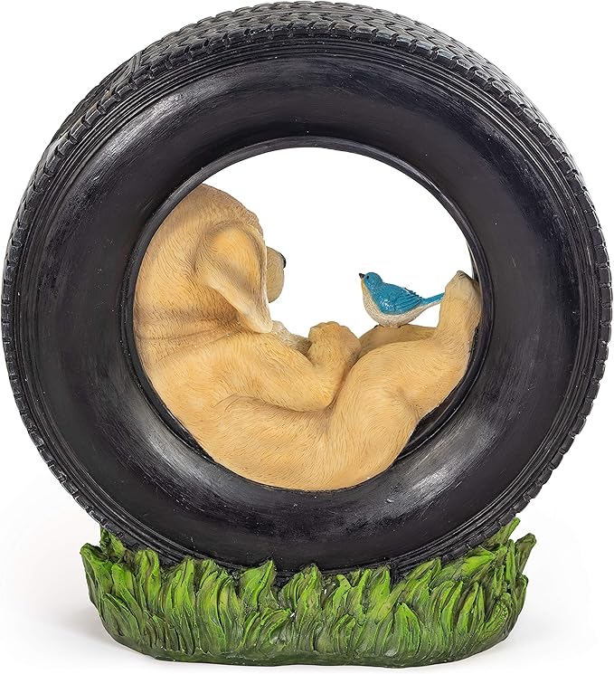 🐶Measures: 11.5"W x 12.5"H x 4.5"D. It is conveniently sized to be the perfect garden accent piece. This statue is made of durable polyresin and has rechargeable batteries included.