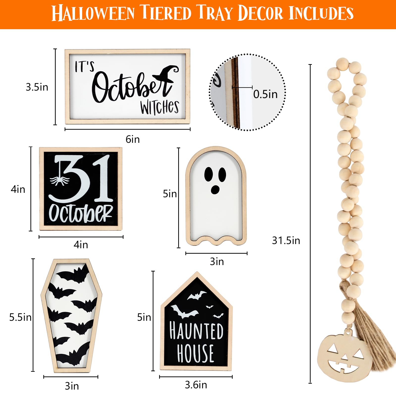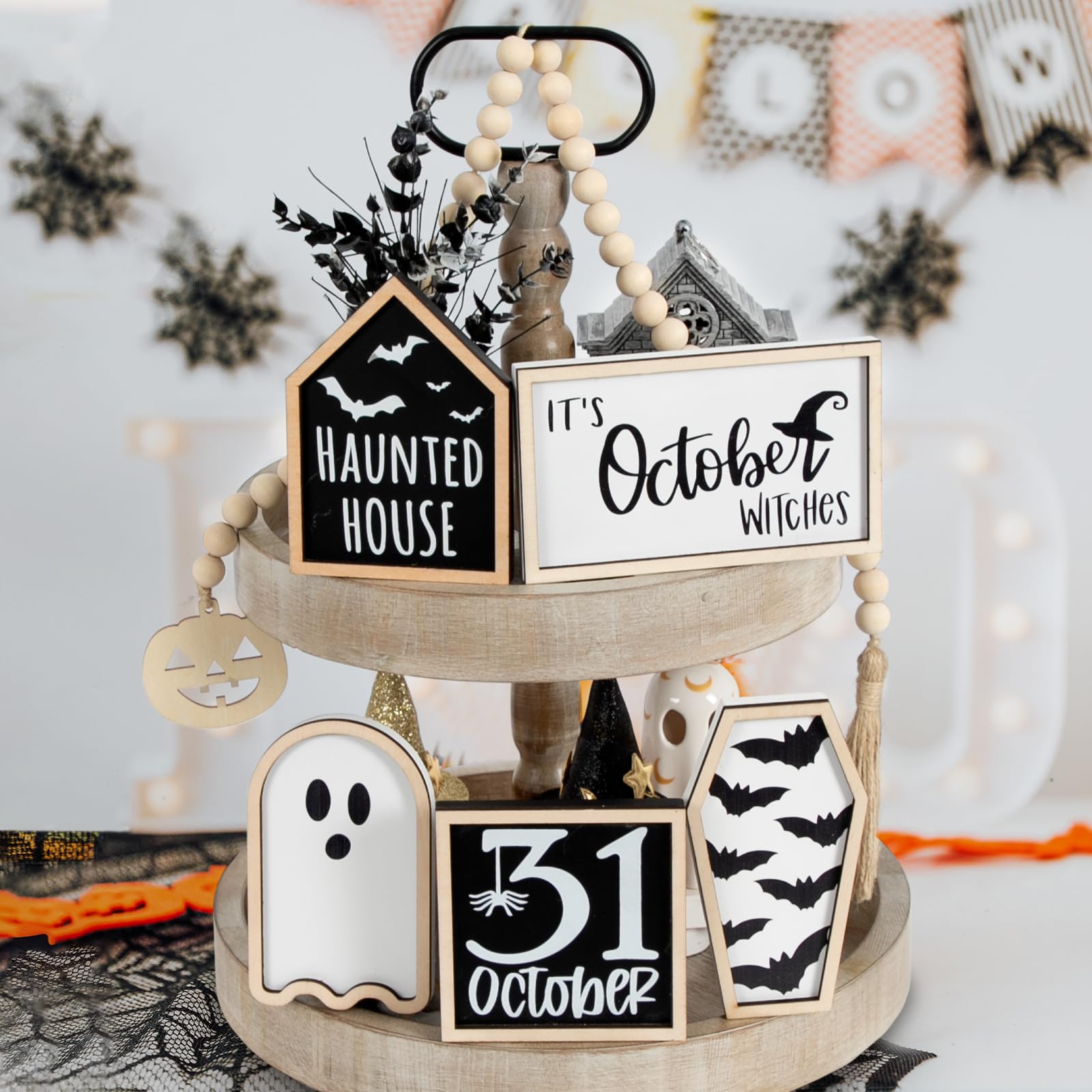 👉Spooky Halloween Decorations -- The pack includes 5 wooden Halloween signs and bead garland that will surely be a hit of your Halloween home decor! (Tiered Tray NOT Included)
