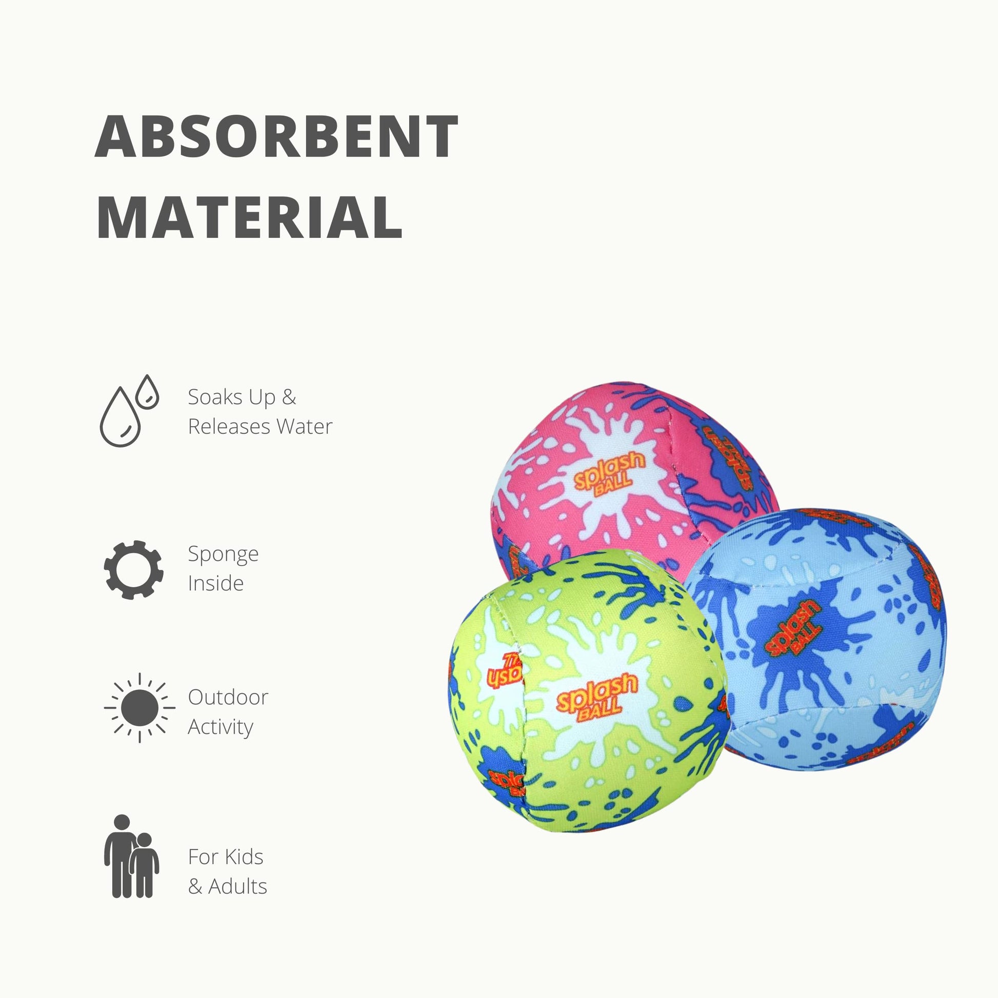 - 24 SPLASH BALLS: Features vivid neon colors Blue, green, pink. Nylon absorbent fabric covered foam balls. Each ball measures 3" inches in diameter. Just let the balls soak up water and they are ready to toss.